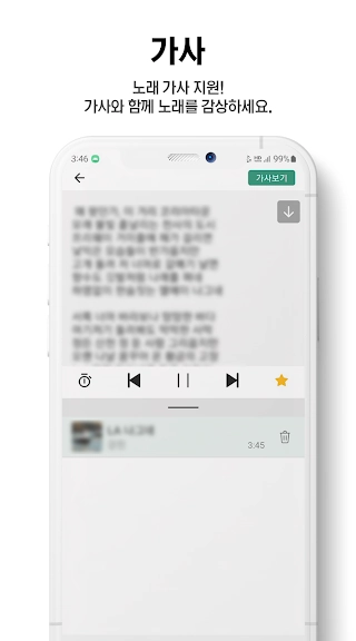 ▶ 가사가 보여서 좋고 선태곡이 반복 재생이라서좋은데 연속듣기와 한번만 듣기 한곡만 반복듣기가 표시가 됐으면 좋겠네요