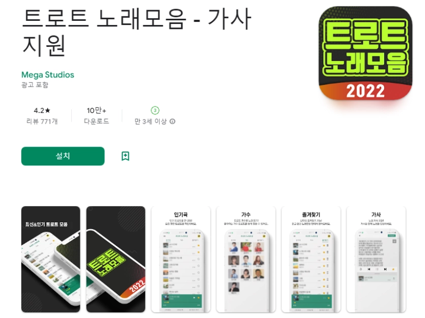 이 어플은 구글플레이스토어에서 "트로트 무료듣기"로 검색했을때 1번째로 나오는 어플입니다. 아래는 트로트 노래모음 - 가사 지원 어플에 대한 자세한 설명이니 참고하세요.