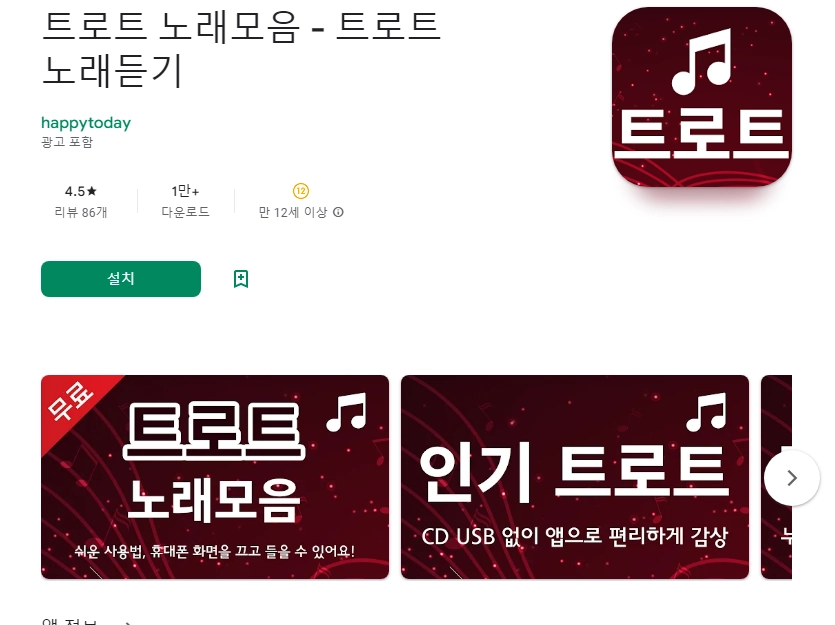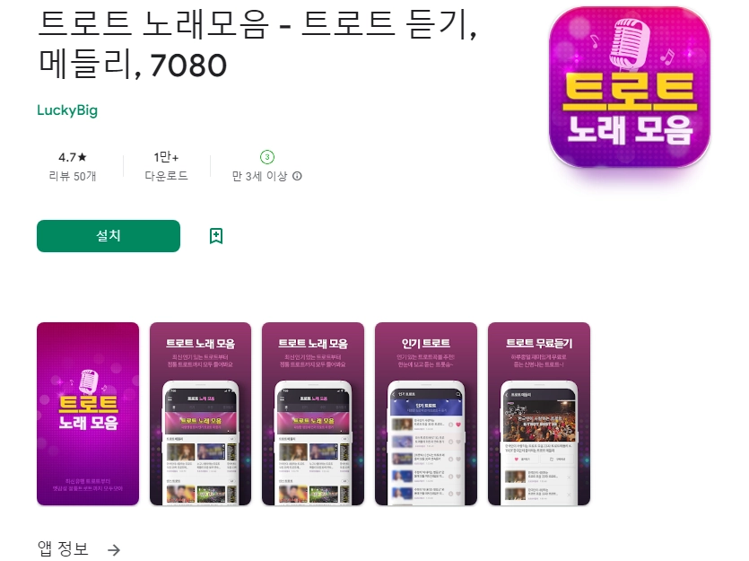 이 어플은 구글플레이스토어에서 "트로트 무료듣기"로 검색했을때 3번째로 나오는 어플입니다. 아래는 트로트 노래모음 - 트로트 노래듣기 어플에 대한 자세한 설명이니 참고하세요.