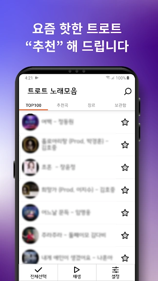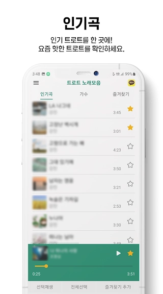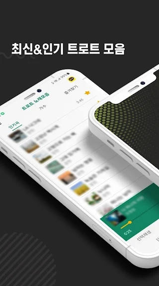 최신 인기곡 트로트 및 기타 가요를 고음질로 청취할 수 있습니다.