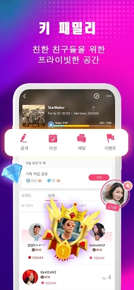 다양한 상호 작용 방식을 지원합니다. 다양한 종류의 방을 만들고 언제든지 누구와도 노래를 부르거나 함께 게임 할 수 있습니다. 같은 취향을 가진 사람들과 관심사를 공유할 수도 있습니다. 또는 다른 사람의 방에 참여하여 전 세계에서 활동중인 새로운 친구들을 만날 수도 있습니다. 방에서 최고의 플레이어 또는 진정한 가수가 누구인지 확인해보세요.