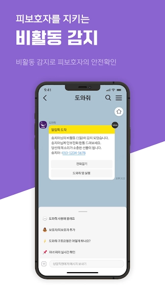 • 비활동감지 알림 : 자녀(피보호자)의 스마트폰 움직임이 설정시간 동안 움직임이 없으면, 등록된 보호자에게 카카오톡 알림이 전송되어 위급상황시 빠르게 대처가 가능합니다.