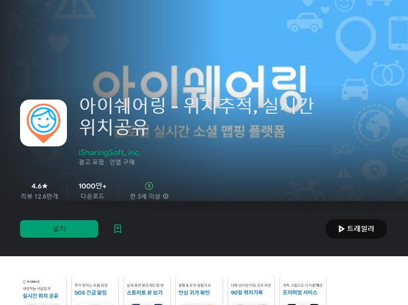 이 어플은 구글플레이스토어에서 "가족 위치추적"로 검색했을때 4번째로 나오는 어플입니다. 아래는 아이쉐어링 - 위치추적, 실시간 위치공유 어플에 대한 자세한 설명이니 참고하세요.
