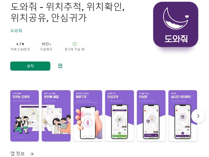 이 어플은 구글플레이스토어에서 "가족 위치추적"로 검색했을때 2번째로 나오는 어플입니다. 아래는 도와줘 - 위치추적, 위치확인, 위치공유, 안심귀가 어플에 대한 자세한 설명이니 참고하세요.