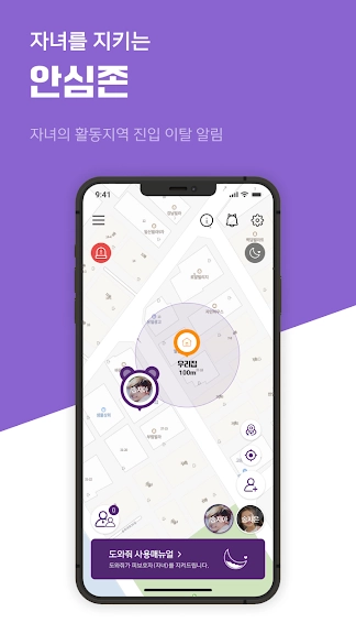 • 안심존 알림 (진입 및 이탈 알림) : 자녀(피보호자)의 활동장소의 반경을 지정해 놓으면 자녀(피보호자)가 지정해 놓은 장소의 진입 및 이탈에 대한 알림이 보호자에게 전송이 됩니다.