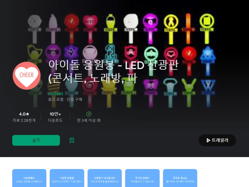 이 어플은 구글플레이스토어에서 "콘서트 응원문구 어플"로 검색했을때 5번째로 나오는 어플입니다. 아래는 아이돌 응원봉 - LED 전광판 (콘서트, 노래방, 파 어플에 대한 자세한 설명이니 참고하세요.
