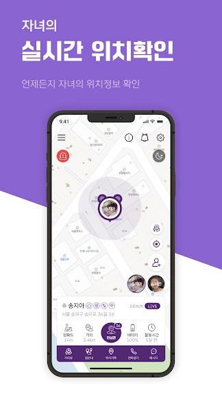 • 실시간 위치추적, 위치확인 : 자녀(피보호자)의 현재 위치를 실시간으로 확인 할 수 있습니다.