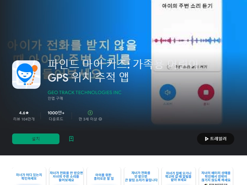 이 어플은 구글플레이스토어에서 "무료 자녀 위치추적"로 검색했을때 3번째로 나오는 어플입니다. 아래는 파인드 마이 키즈: 가족용 어린이 GPS 위치 추적 앱 어플에 대한 자세한 설명이니 참고하세요.