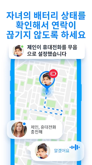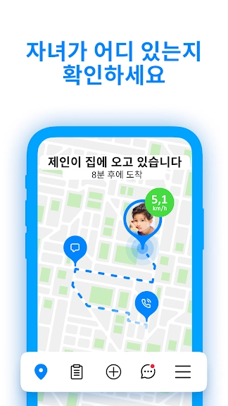 GPS 위치추적 -지도에서 자녀의 위치와 하루 동안의 이동 기록을 확인해 보세요. 아이가 가야 할 곳에 있는지, 또 위험한 장소를 가지는 않았는지 실시간으로 체크할 수 있습니다.