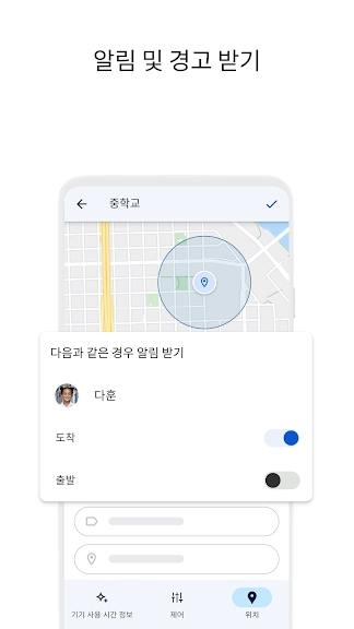 • 알림 받기: Family Link는 자녀가 도착하거나 특정 위치를 떠날 때를 비롯한 중요한 알림을 전송합니다. 기기의 벨소리를 울리고 기기의 배터리 잔량을 확인할 수도 있습니다.