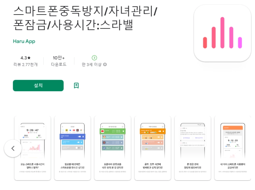 아래는 스마트폰중독방지/자녀관리/폰잠금/사용시간:스라밸 어플에 대한 스크린샷 정보입니다.