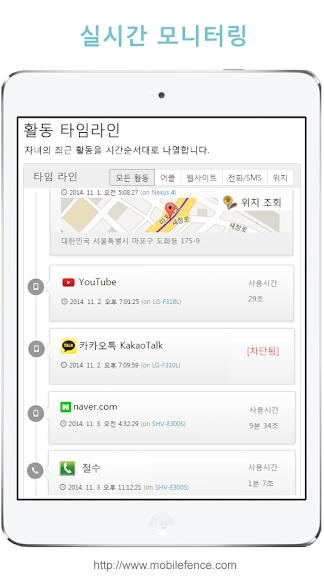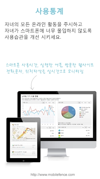 스마트폰 이용시간, 자주 사용한 어플 목록, 어플별 사용시간 통계를 통해서 자녀의 모든 온라인 활동을 정확하게 파악할 수 있습니다.