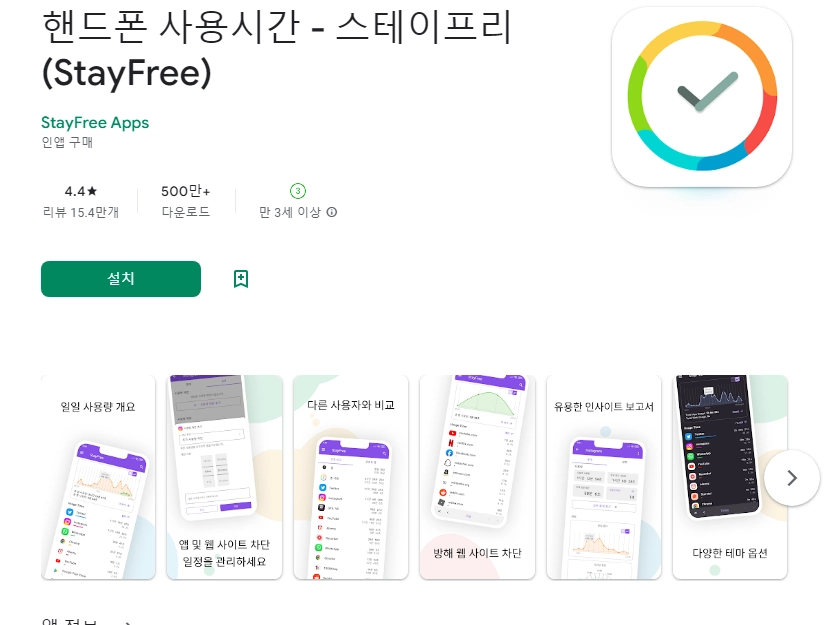 이 어플은 구글플레이스토어에서 "자녀 핸드폰 사용시간제한"로 검색했을때 4번째로 나오는 어플입니다. 아래는 핸드폰 사용시간 - 스테이프리 (StayFree) 어플에 대한 자세한 설명이니 참고하세요.