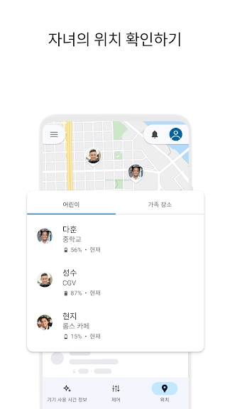 • 자녀의 위치 확인: 이동 중에 가족을 찾을 수 있다면 큰 도움이 됩니다. Family Link를 사용하면 자녀가 기기를 갖고 있는 동안 지도에서 자녀의 위치를 확인할 수 있습니다.
