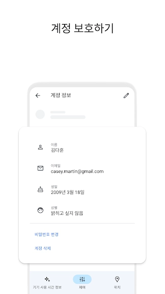 • 자녀의 계정 보안 설정: Family Link를 사용하여 자녀의 계정 및 데이터 설정을 관리할 수 있습니다. 부모님은 자녀가 비밀번호를 잊어버린 경우 변경 또는 재설정하거나, 자녀의 개인 정보를 수정하거나, 필요한 경우 자녀의 계정을 삭제할 수 있도록 도와줄 수 있습니다.