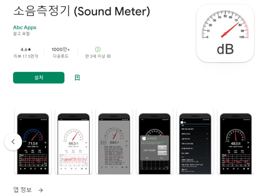 이 어플은 구글플레이스토어에서 "소음측정기"로 검색했을때 4번째로 나오는 어플입니다. 아래는 소음측정기: DB 측정기, 소음 측정기, SPL 측정기 어플에 대한 자세한 설명이니 참고하세요.