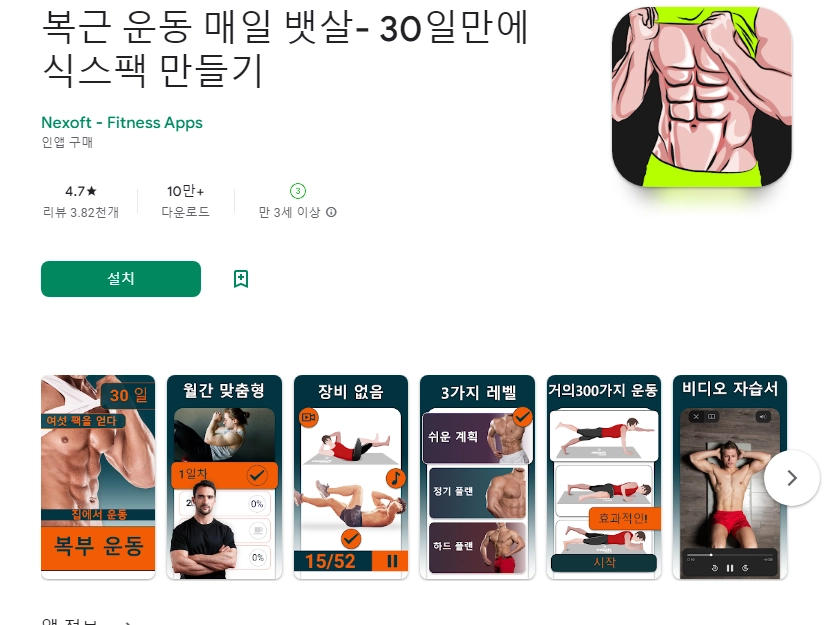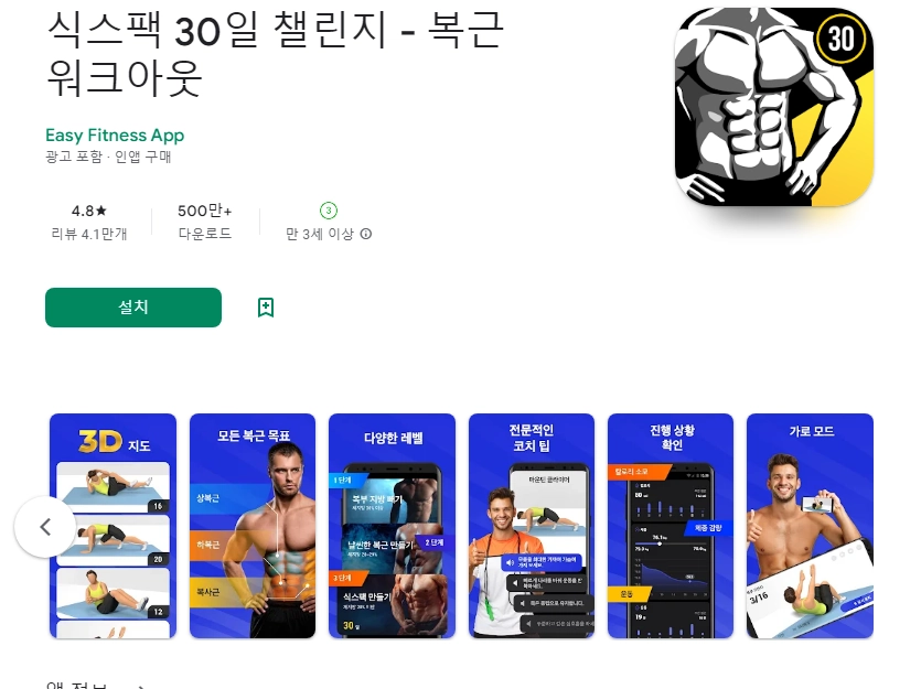 이 어플은 구글플레이스토어에서 "복근 만들기"로 검색했을때 4번째로 나오는 어플입니다. 아래는 복근 운동 매일 뱃살- 30일만에 식스팩 만들기 어플에 대한 자세한 설명이니 참고하세요.