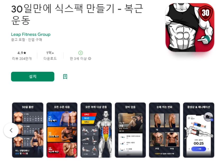 아래는 30일만에 식스팩 만들기 - 복근 운동 어플에 대한 스크린샷 정보입니다.