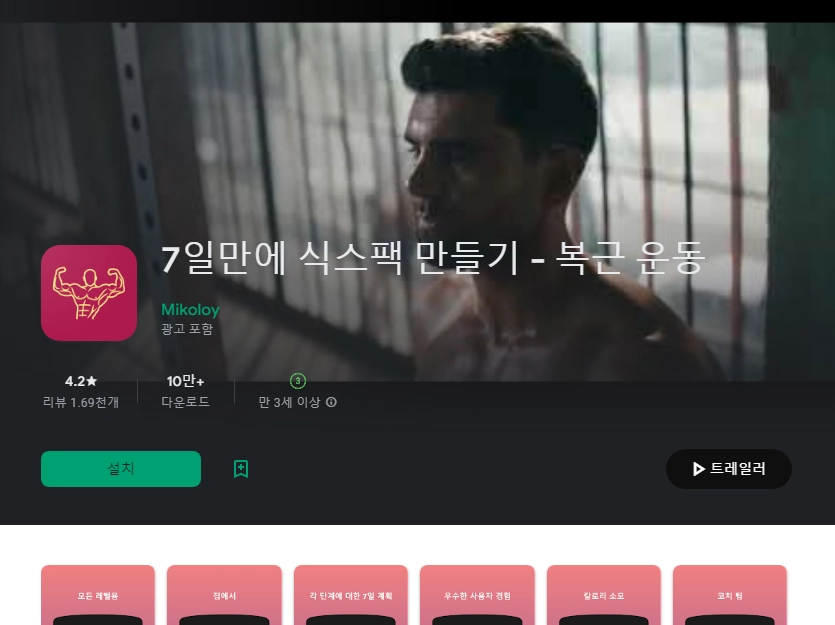 이 어플은 구글플레이스토어에서 "복근 만들기"로 검색했을때 3번째로 나오는 어플입니다. 아래는 7일만에 식스팩 만들기 - 복근 운동 어플에 대한 자세한 설명이니 참고하세요.