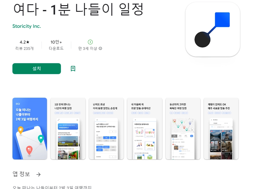 이 어플은 구글플레이스토어에서 "국내 여행지 추천"로 검색했을때 4번째로 나오는 어플입니다. 아래는 여다 - 1분 나들이 일정 어플에 대한 자세한 설명이니 참고하세요.