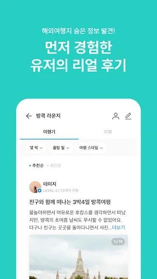 ③ 후기: 여행을 다녀온 후, 여러분의 후기를 공유할 수 있습니다. 물론 여행을 떠나기 전 다른 분들이 올린 후기도 참고하여 최적의 여행지를 선택할 수도 있습니다.