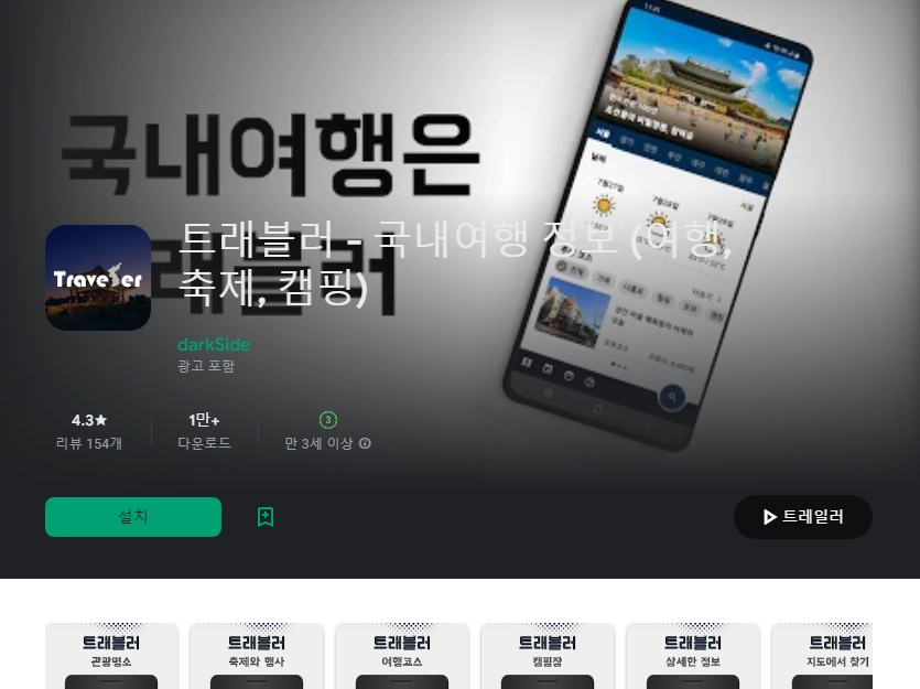 이 어플은 구글플레이스토어에서 "국내 여행지 추천"로 검색했을때 3번째로 나오는 어플입니다. 아래는 트래블러 - 국내여행 정보 (여행, 축제, 캠핑) 어플에 대한 자세한 설명이니 참고하세요.
