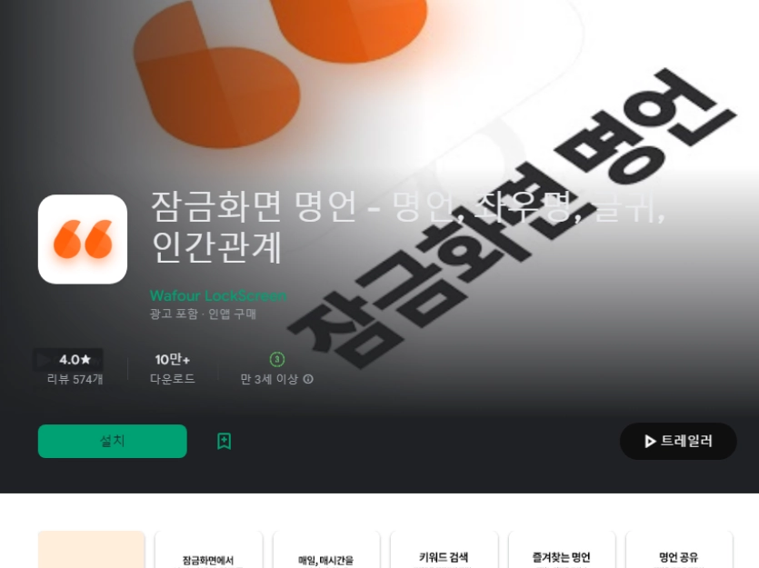 이 어플은 구글플레이스토어에서 "잠금화면 명언"로 검색했을때 1번째로 나오는 어플입니다. 아래는 잠금화면 명언 - 명언, 좌우명, 글귀, 인간관계 어플에 대한 자세한 설명이니 참고하세요.