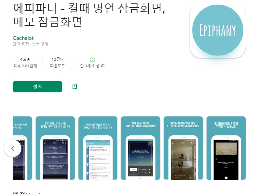 이 어플은 구글플레이스토어에서 "잠금화면 명언"로 검색했을때 3번째로 나오는 어플입니다. 아래는 에피파니 - 켤때 명언 잠금화면, 메모 잠금화면 어플에 대한 자세한 설명이니 참고하세요.