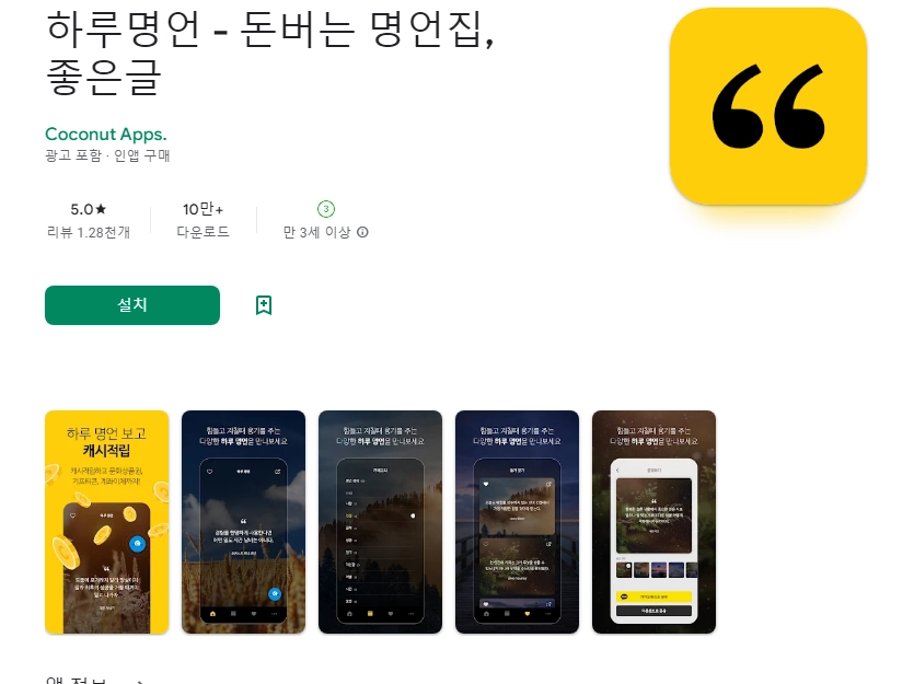 이 어플은 구글플레이스토어에서 "잠금화면 명언"로 검색했을때 5번째로 나오는 어플입니다. 아래는 하루명언 - 돈버는 명언집, 좋은글 어플에 대한 자세한 설명이니 참고하세요.