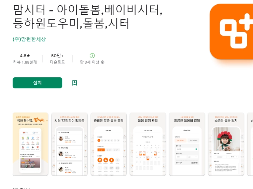 이 어플은 구글플레이스토어에서 "베이비시터"로 검색했을때 1번째로 나오는 어플입니다. 아래는 맘시터 - 아이돌봄,베이비시터,등하원도우미,돌봄,시터 어플에 대한 자세한 설명이니 참고하세요.