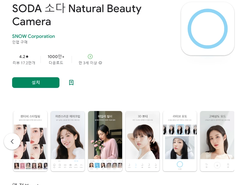 이 어플은 구글플레이스토어에서 "보정 카메라"로 검색했을때 4번째로 나오는 어플입니다. 아래는 SODA 소다 Natural Beauty Camera 어플에 대한 자세한 설명이니 참고하세요.