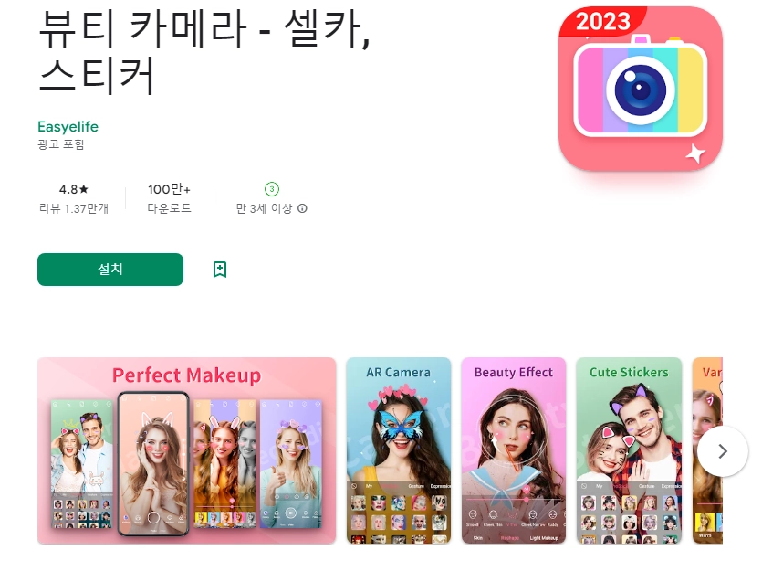 이 어플은 구글플레이스토어에서 "보정 카메라"로 검색했을때 5번째로 나오는 어플입니다. 아래는 뷰티 카메라 - 셀카, 스티커 어플에 대한 자세한 설명이니 참고하세요.