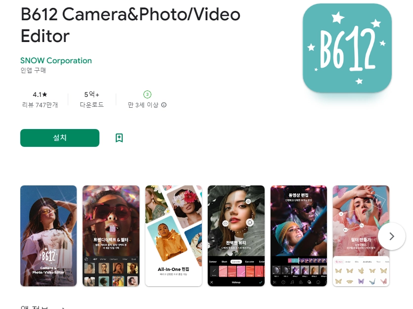 이 어플은 구글플레이스토어에서 "보정 카메라"로 검색했을때 2번째로 나오는 어플입니다. 아래는 B612 Camera&Photo/Video Editor 어플에 대한 자세한 설명이니 참고하세요.
