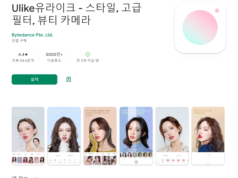 이 어플은 구글플레이스토어에서 "보정 카메라"로 검색했을때 3번째로 나오는 어플입니다. 아래는 Ulike유라이크 - 스타일, 고급 필터, 뷰티 카메라 어플에 대한 자세한 설명이니 참고하세요.