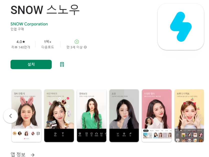 이 어플은 구글플레이스토어에서 "보정 카메라"로 검색했을때 1번째로 나오는 어플입니다. 아래는 SNOW 스노우 어플에 대한 자세한 설명이니 참고하세요.