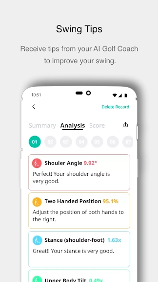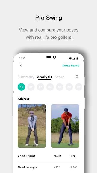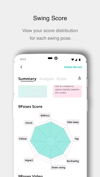 * 나인포즈는 실시간 리포트를 제공하여 내 스윙의 문제점과 수정방향을 즉각적으로 확인할 수 있습니다.