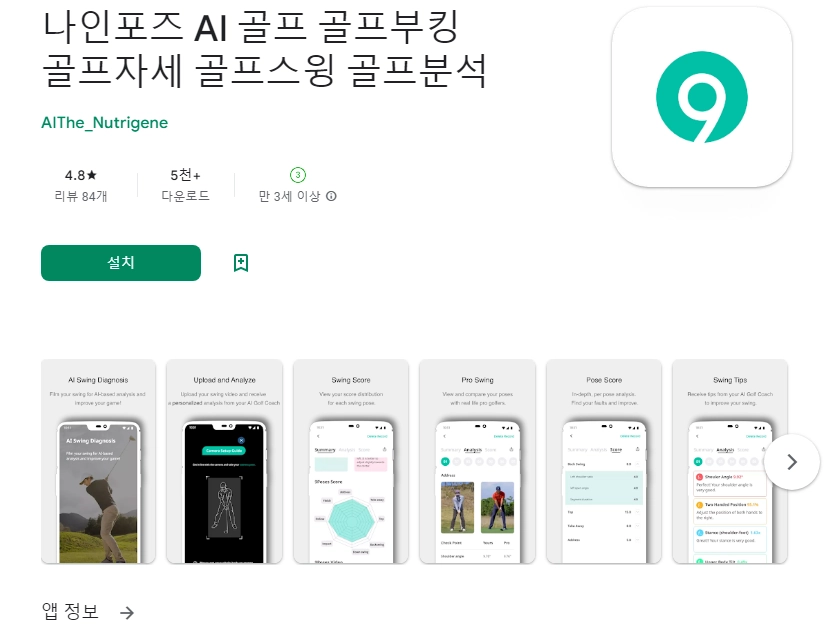 이 어플은 구글플레이스토어에서 "골프 스윙 분석"로 검색했을때 3번째로 나오는 어플입니다. 아래는 나인포즈 AI 골프 골프부킹 골프자세 골프스윙 골프분석 어플에 대한 자세한 설명이니 참고하세요.