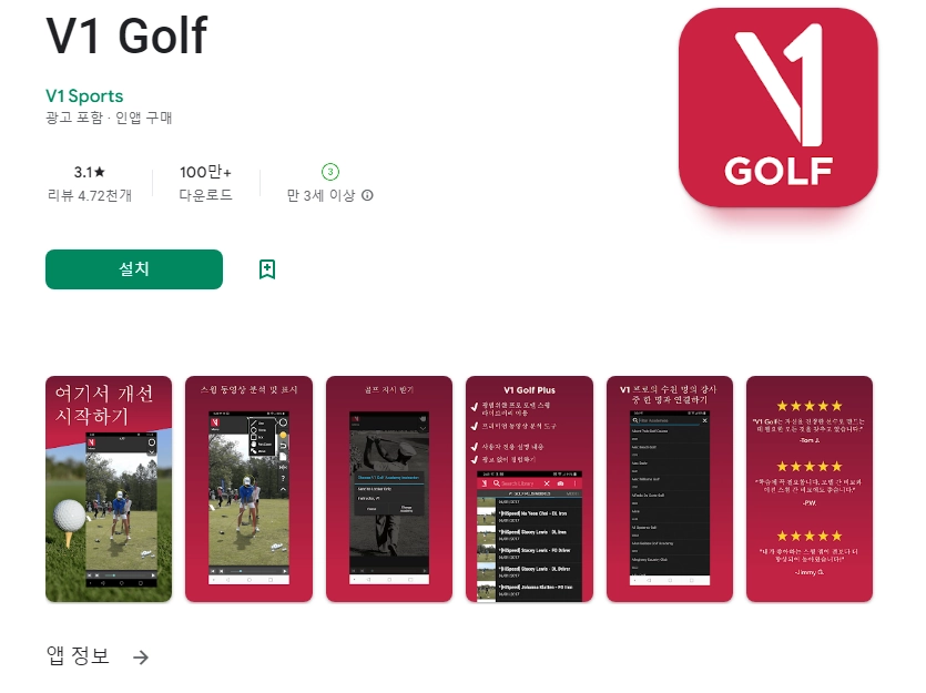 이 어플은 구글플레이스토어에서 "골프 스윙 분석"로 검색했을때 4번째로 나오는 어플입니다. 아래는 V1 Golf 어플에 대한 자세한 설명이니 참고하세요.