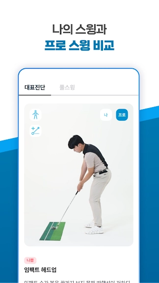 - 프로의 스윙과 나의 스윙 비교, 정면과 측면스윙 비교, 베스트 스윙과 현재스윙비교 등 스윙비교를 통한 분석이 가능합니다.