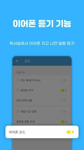 - 이어폰 모드 지원하여 조용한 독서실에서도 OK
