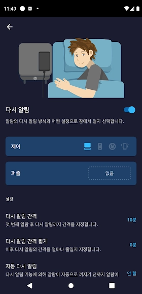 ▶ 매우 좋습니다!! 유료여도 쓸 것 같아요. 특히, 안일어난 상태로 알람을 끄지는 못하게 설정가능해서 매우 맘에 듭니다 그런데, '다시알림기간짧게'는 무슨 기능인지요? 알려주시면 감사하겠습니다~!