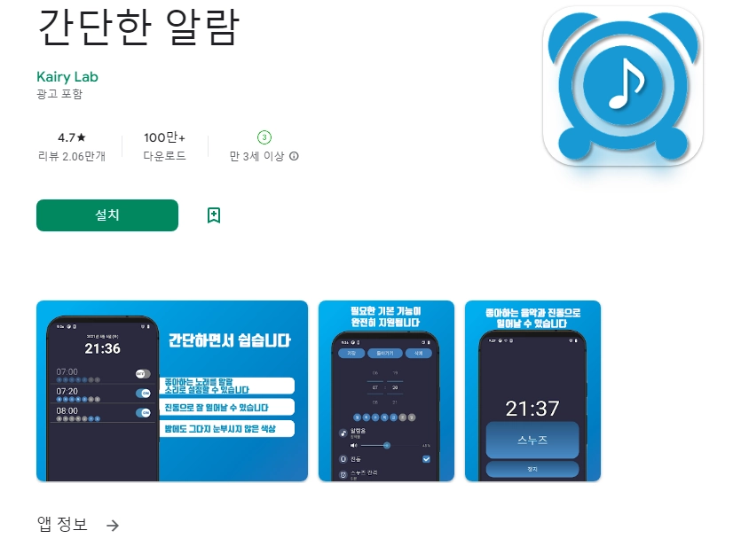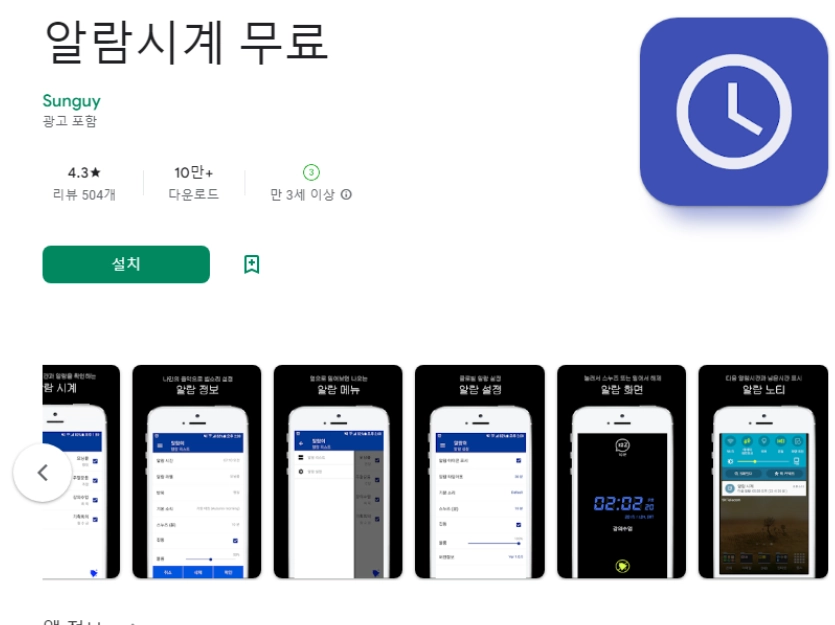 이 어플은 구글플레이스토어에서 "무료 알람"로 검색했을때 1번째로 나오는 어플입니다. 아래는 알람시계 무료 어플에 대한 자세한 설명이니 참고하세요.
