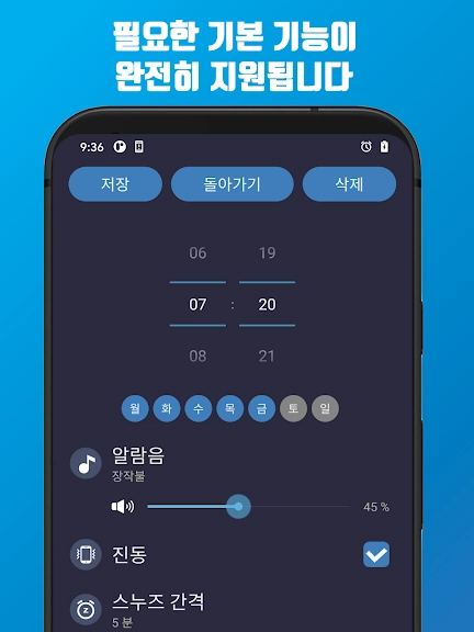 - 스누즈, 타임아웃, 진동, 기본소리, 볼륨조절