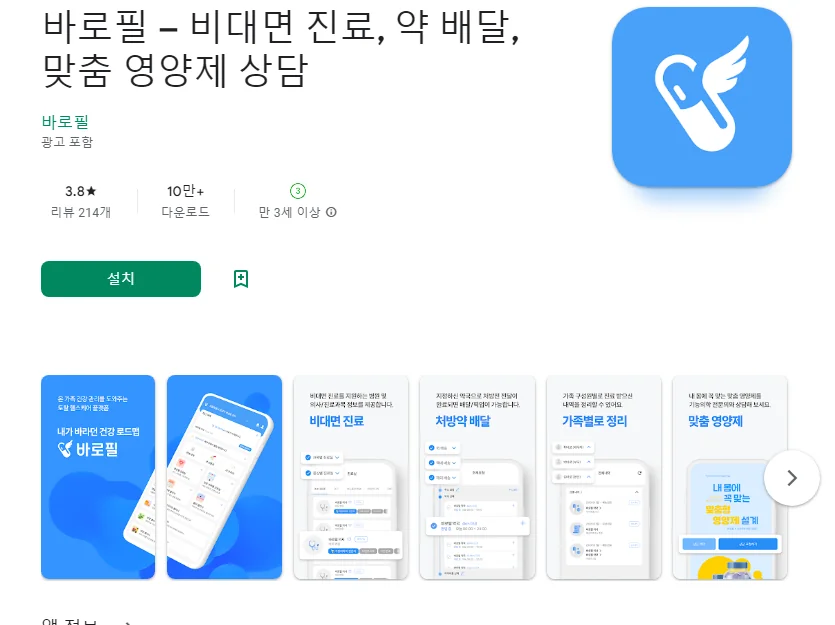 이 어플은 구글플레이스토어에서 "비대면 진료 약배달"로 검색했을때 5번째로 나오는 어플입니다. 아래는 바로필 – 비대면 진료, 약 배달, 맞춤 영양제 상담 어플에 대한 자세한 설명이니 참고하세요.