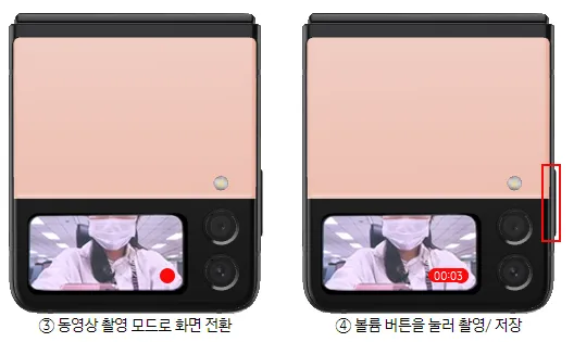 접힌 상태에서 측면(지문인식) 버튼을 빠르게 두번 선택→ 사진 모드에서 우측 방향으로 드래그→ 동영상 모드로 전환→ 볼륨 버튼을 눌러 촬영 시작→ 볼륨 버튼을 눌러 촬영 종료후 자동 저장