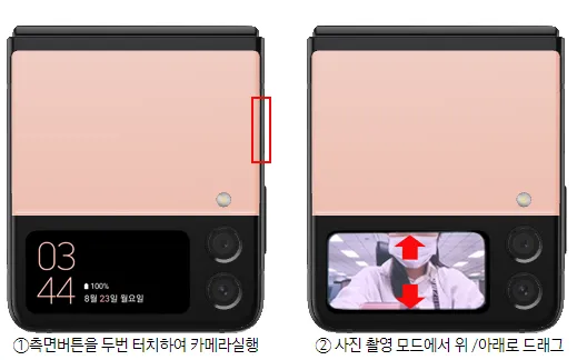 접힌 상태에서 측면(지문인식) 버튼을 빠르게 두번 선택→ 촬영할 이미지가 표시되면→ 볼륨 버튼을 눌러 촬영하세요.