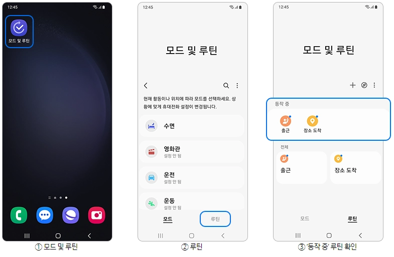 상단바 아래로 밀기 (퀵 패널) - 루틴 알림 클릭 - 실행 중 루틴 확인