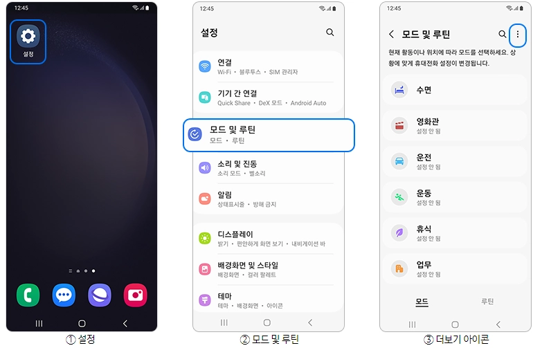안드로이드 13 OS에서는 빅스비 루틴 앱에서 제공하던 기능을 설정 > 모드 및 루틴 메뉴로 제공됩니다. “모드” 탭에서 상황에 맞게 휴대전화 설정을 할 수 있으며 “루틴” 탭에서 기존 루틴을 추가, 검색 및 관리할 수 있습니다.