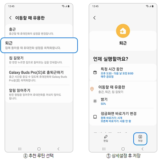 모드 및 루틴 실행 > 루틴 > 추천 아이콘 > 추천 루틴 선택 > 상세설정 후 저장