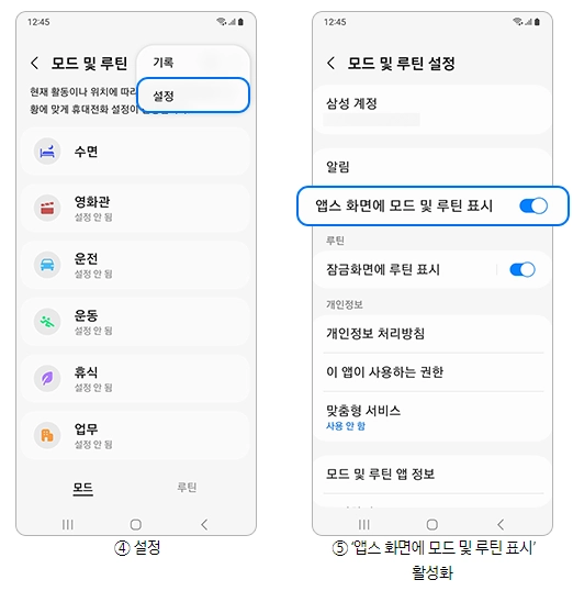 설정 > 모드 및 루틴 > 더보기 아이콘 > 설정 > ‘앱스 화면에 모드 및 루틴 표시’ 활성화
